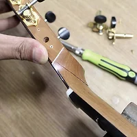 프렛은 모양이 동그랗게 나와서, 줄과의 접점이 아주 좁아야 깔끔하게 소리가 납니다. 그러나 위 사진처럼 레벨링을 하고 나면 프렛 윗면이 편평하게 깎이게 되므로, 파일을 이용하여 다시 동그랗게 가공을 해 줍니다.